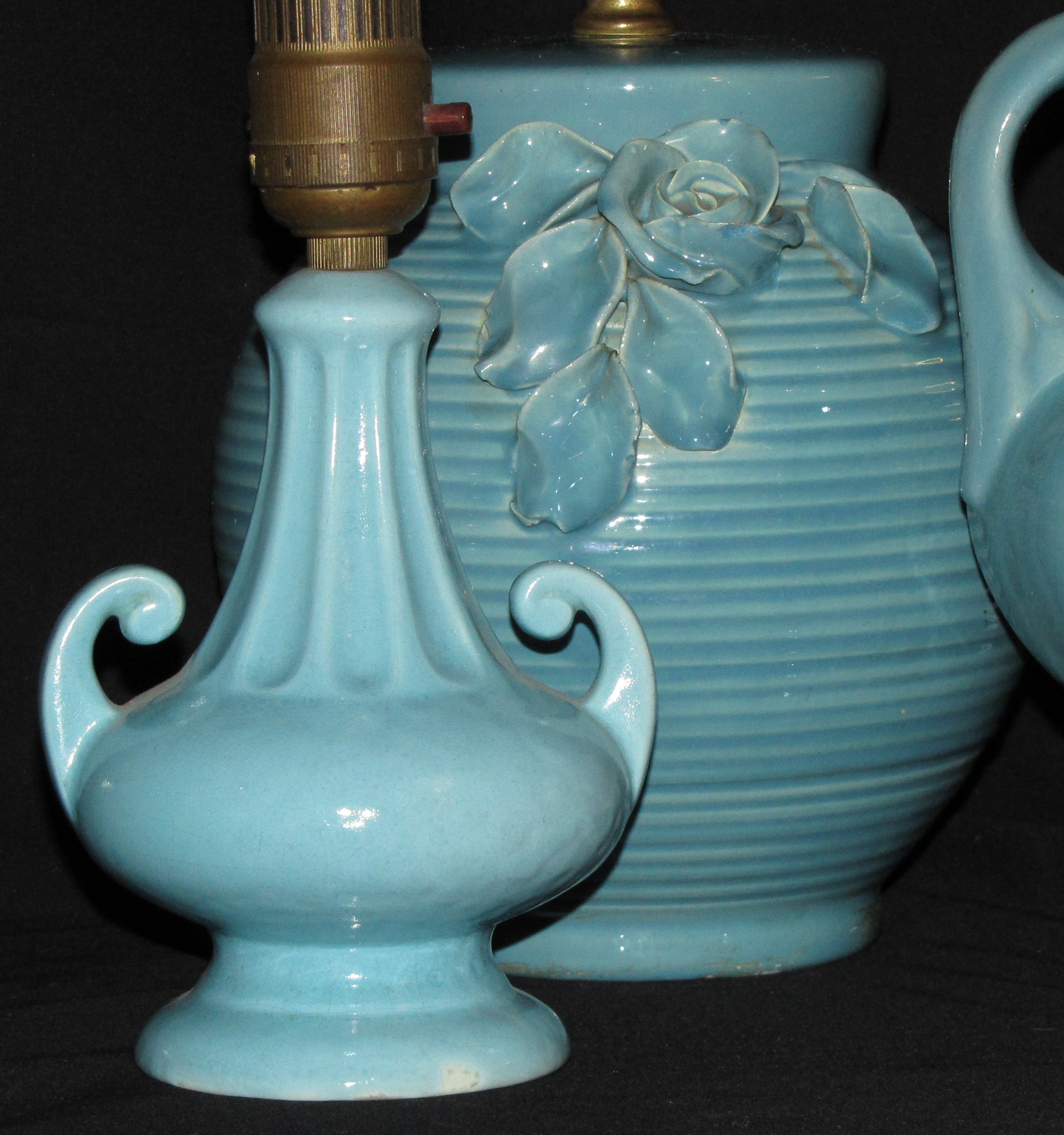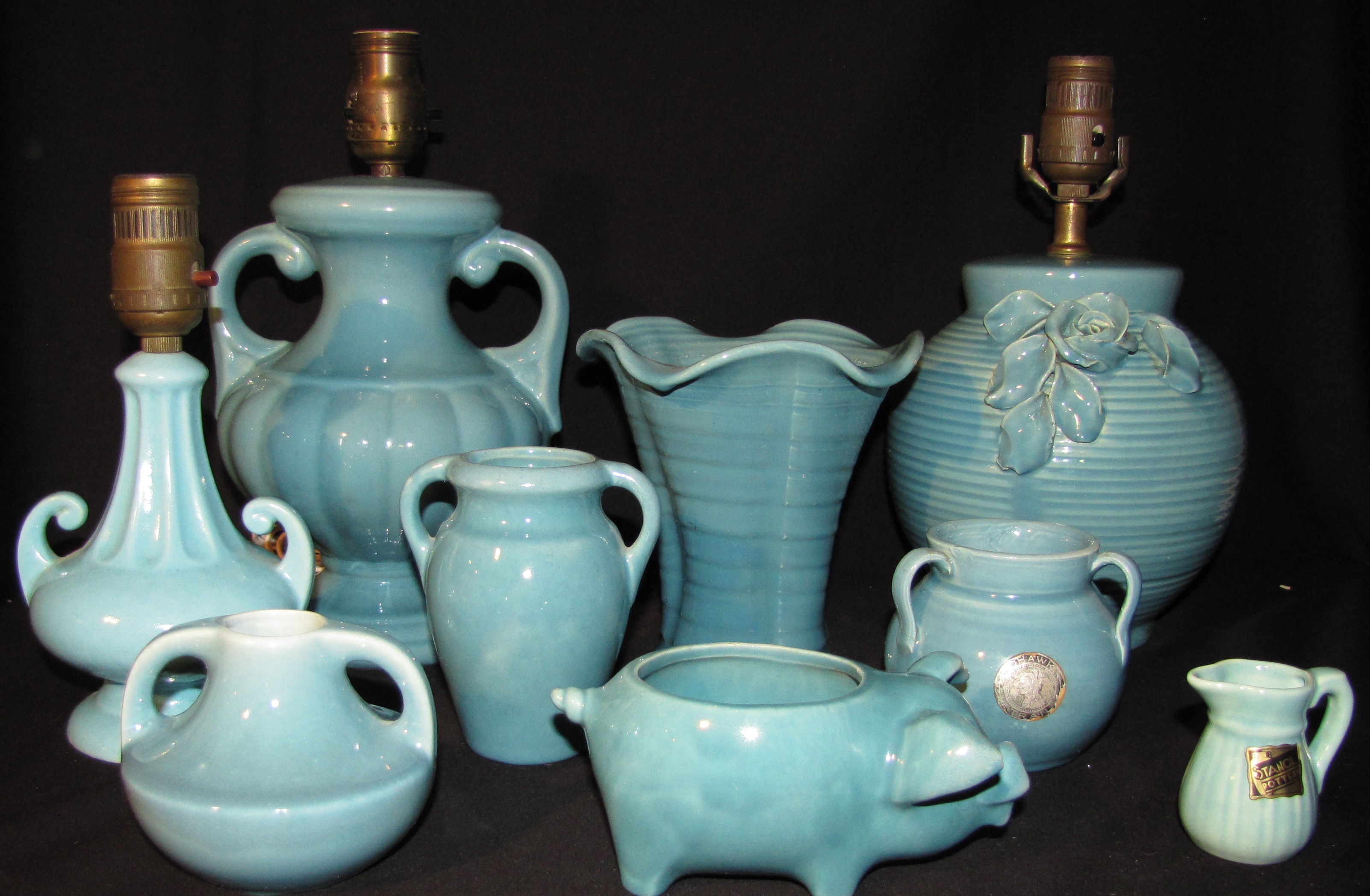 More frequently this glaze can be found on lamps. Larger examples are easier to find but as with the mold cast artware, this glaze can be unexciting on flat surfaces. Finding nice, well fired examples that are on a body that allows the glaze to have depth are truly rare indeed but can be the show piece in any collection.